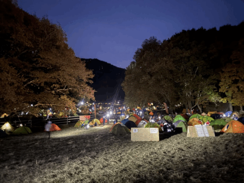 夕方、キャンプ地に到着したときには暗くなっており。テント村が多数の明かりで綺麗に輝いていた。